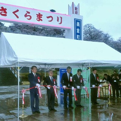 10日、公園で行ったオープニングセレモニーで、同協会本荘支部の猪股春夫支部長が「今年は鮮やかな桜の花の下で開始できて喜ばしい。多くの人に足を運んでもらえるよう、イベントを企画した」とあいさつ。猪股支部長や湊貴信市長ら5人がテープカットし、開幕を祝った。