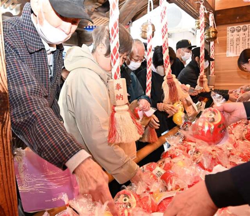 この日は晴天に恵まれ、境内から神社前の通りに長蛇の列ができた。昨年購入しただるまを処分し、新しいだるまを購入する人の姿も見られた。