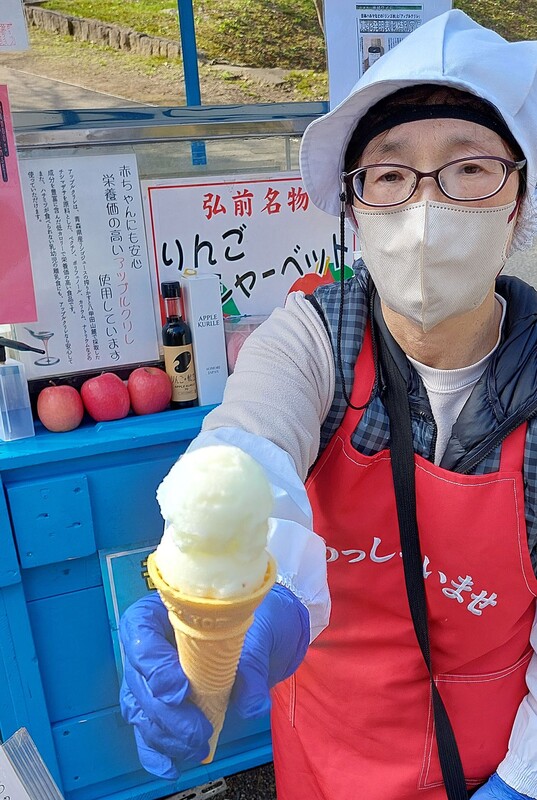 アイスにはアップルクリレを練り込み、紅玉の皮のフリーズドライをトッピング。市民に親しまれてきた素朴な味わいに、新たな風味を加えた。5月5日まで追手門付近の屋台で1個200円で販売。来園者から「さっぱりしておいしい」との声が上がっている。藤田アイス店の藤本レイ子社長(65)は「屋台アイスに新しい要素を取り入れ、話題をつくっていきたい」と意気込む。