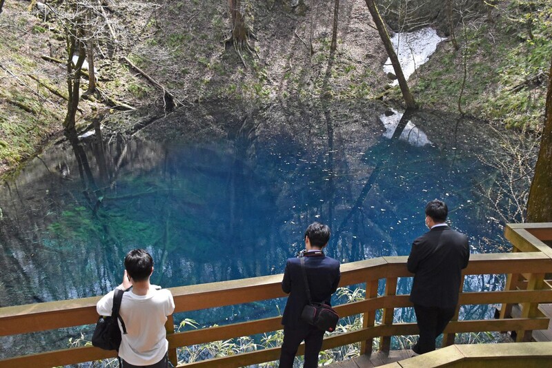 世界自然遺産・白神山地の西側の麓にある青森県深浦町の十二湖が15日、山開きを迎えた。町関係者ら約100人が観光シーズンの安全を祈るとともに、春の陽光を受けてコバルトブルーに輝く人気スポット「青池」の景色を堪能。「今年こそ入り込み客数10万人超えを」と期待していた。