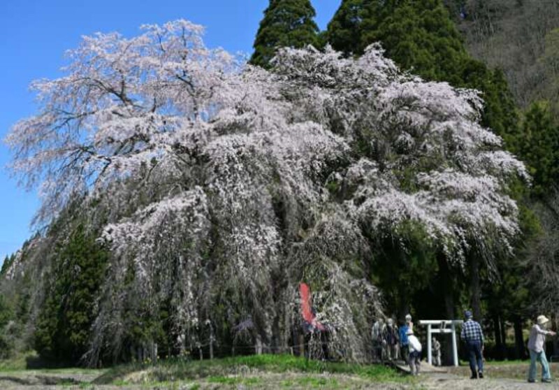 枝垂れ桜は樹齢200年以上とされ、樹高約10メートル、幹の太さ約3・6メートル、枝張り約20メートル。国道13号と国道108号の交差点近くに広がる田畑の一角、地域住民が「おしら様」と呼ぶ白山神社の近くにある。