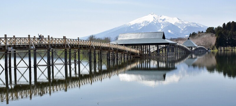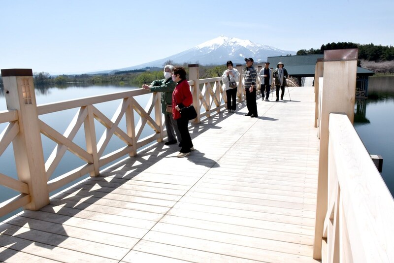 1994年完成の「鶴の舞橋」は、廻堰(まわりぜき)大溜池(津軽富士見湖)に架かる日本一長い木造三連太鼓橋。老朽化のため、2023年度から毎年100メートルずつ改修工事を行った。20~22年度には橋脚工事も行い、総事業費は8億1500万円。負担割合は国55%、県27.5%、町17.5%。