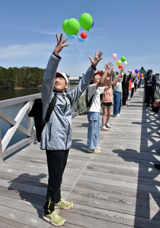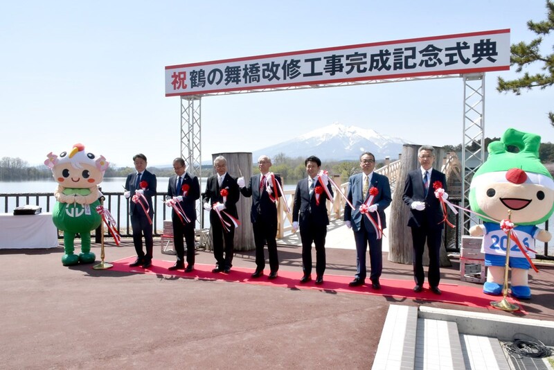 2023年から青森県によって進められてきた鶴田町の観光名所「鶴の舞橋」(全長約300メートル)の大規模改修工事が完了し、17日開通した。同日、町が橋のたもとで記念式典を実施。町や県、国などの関係者や地元の小中学生ら約230人が県産ヒバ・スギを使った真新しい橋を渡り初めし、節目を祝った。