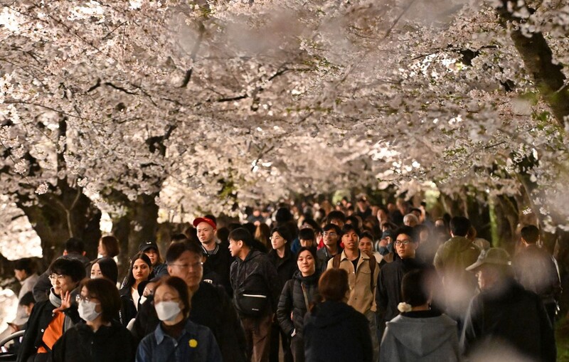 弘前さくらまつりが開かれている青森県弘前市の弘前公園は19日、好天に誘われた行楽客で大にぎわいとなった。前日に満開を迎えた西堀の「桜のトンネル」にも人出が集中。夜遅くまでライトアップされた桜を楽しむ人々が行き交った。