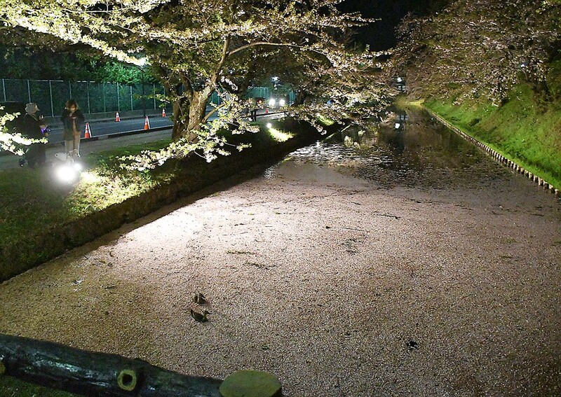 弘前さくらまつりが開催中の弘前公園(青森県弘前市)で、散った桜の花びらが堀を埋め尽くす「花筏(はないかだ)」が22日、見ごろを迎えた。夜にはライトアップされ、観光客らが夜桜を楽しみながら幻想的な雰囲気に浸った。市は花筏の見ごろを23日ごろまでと予想している。