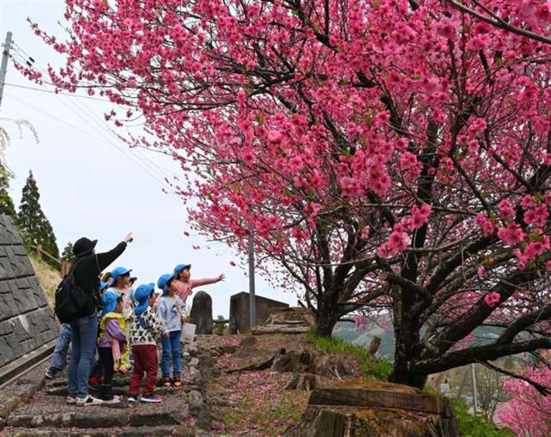 園児は参道を歩きながら「きれい」と声を上げ、花を眺めたり、落ちた花びらを集めたりしてにぎやかにお花見。三浦悠晴ちゃん(5)は「お花の色がピンクでかわいかった」と笑顔で話した。