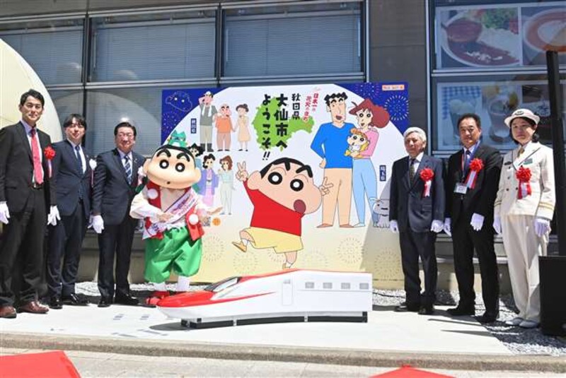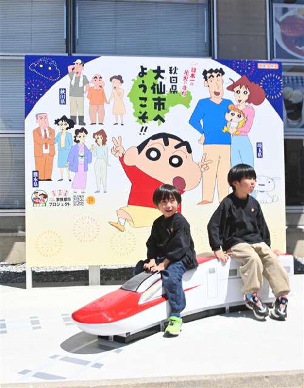 人気アニメ「クレヨンしんちゃん」の主人公野原しんのすけの父ひろしが「大曲」出身という縁で25日、秋田県大仙市のJR大曲駅にしんちゃんのフォトスポットが設置された。しんのすけたちのイラストパネルと、秋田新幹線こまちのオブジェから成る。完成セレモニーが現地で開かれ、老松博行市長ら関係者が出席。親子連れが撮影を楽しんだ。