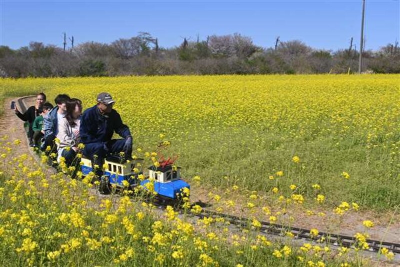 サンルーラル大潟北側の菜の花畑約1・8ヘクタールは地元の「大潟村耕心会」が手入れしており、美しい“黄色いじゅうたん”が来場者の目を楽しませている。摘み取り体験(26、29日)ができるほか、ミニ電車は全長250メートルのコースを回る。