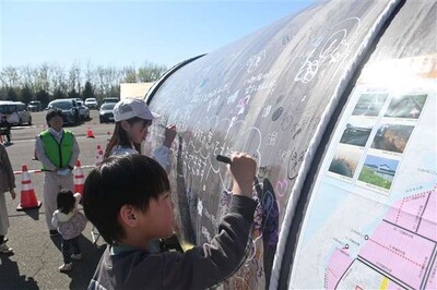 東北農政局八郎潟農業水利事業所は、ドローンシミュレーター体験などを実施。村内の農業用水路を強化プラスチック素材のパイプラインに置き換える事業も紹介し、実際に埋めるパイプライン大型管に来場者が好きなメッセージを書けるコーナーを設けた。26日まで。