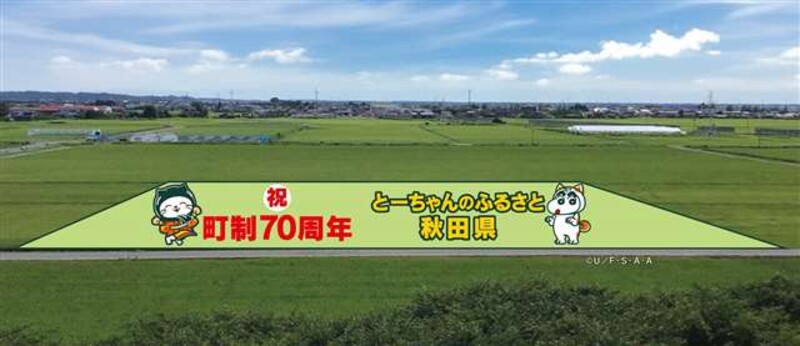 10回目となる今年は、町制施行70周年を祝う特別デザインを企画。秋田、熊本、埼玉の3県と、原作漫画出版元の双葉社(東京)による「家族都市プロジェクト」の一環として実施する。
