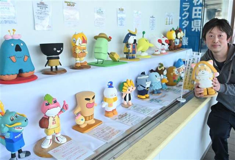 秋田県内外のご当地キャラクターをかたどった粘土人形約90点が、JR大曲駅の東西自由通路に展示されている。作品は漁師で粘土作家の村山裕磨さん(41)=潟上市=が作製した。5月6日まで展示しており、「大型連休中にぜひ見てほしい」と話す。