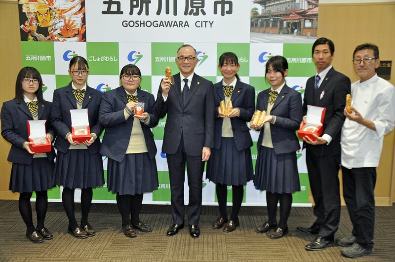 パイは食べ歩きしやすいように、棒状で1個ずつ袋に包まれている。佐々木市長は一戸治孝副市長らと試食し「おいしい。袋に包まれているので皮がこぼれない。高校生の感性が生かされている」と完食した。
