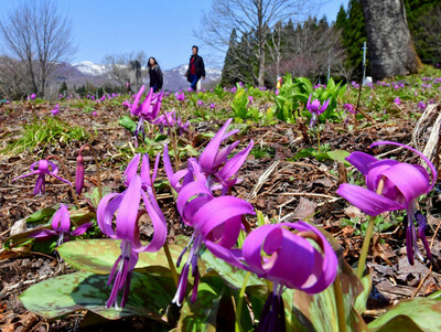 西和賀町のカタクリが見頃に 安ケ沢地区で家族連れにぎわう