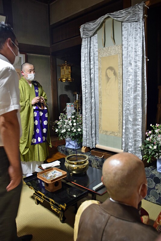 文化財指定に向けての調査では、同寺に絵を寄進した弘前藩の家老が妻と妾(めかけ)を相次いで亡くし、その供養のため応挙に描かせたとみられることなども分かった。須藤住職は「みなさんも供養のため手を合わせてから、どうぞじっくりと見ていただきたい」と呼び掛け、「まぶたは20本もの細い線で描かれています」などと解説しながら、写実的な応挙の画業の世界へといざなっていた。
