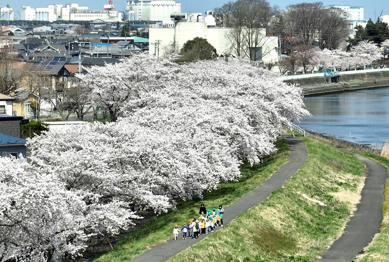 10日の青森県内は高気圧に覆われ、春の陽気で各地で桜の開花が進んだ。八戸市の新井田川沿いでは、早咲きの桜並木が既に咲きそろい、土手を散歩しながら早い春を楽しむ市民の姿が見られた。
