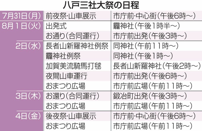三社大祭は7月31日の前夜祭を皮切りに開幕。8月1日の「お通り」と3日の「お還(かえ)り」では龗(おがみ)神社、長者山新羅神社、神明宮の行列や全27山車組の山車が市中心街を練り歩く。2日の中日には山車の夜間合同運行があり、4日の後夜祭で閉幕する。前夜祭、後夜祭では山車の展示とおはやし演奏が行われる。併催行事として長者山新羅神社の「加賀美流騎馬打毬(だきゅう)」(2日)、八戸青年会議所主催の「おまつり広場」(2~4日)も実施する。