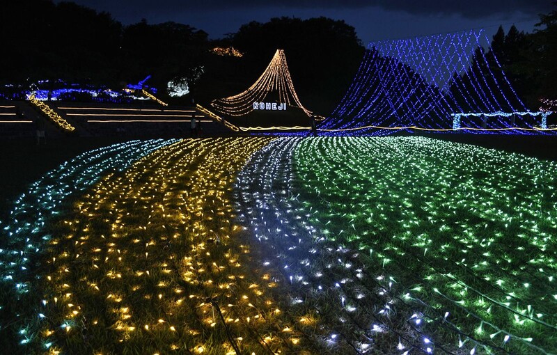 青森県野辺地町の愛宕公園の夜を光で彩る「のへじイルミネーション光物語2024」が9日、始まった。青やピンク、緑など色とりどりの光が公園内に幻想的な世界をつくり出している。9月14日まで。