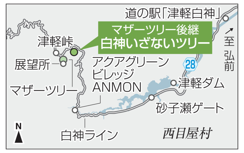 青森県西目屋村や津軽森林管理署(弘前市)などでつくる「白神山地・暗門の滝」森林環境整備推進協議会は23日、枯死した白神山地のマザーツリーに代わる新シンボルツリーの愛称を「マザーツリー後継 白神いざないツリー」に決定したと発表した。マザーツリーがあった場所から1.6キロほど西目屋村寄りにあり、津軽峠周辺の散策道「ブナ巨木ふれあいの径(みち)」の入り口から約2分歩くと到着する。近くに駐車場もあり、マザーツリーよりもアクセスが良くなった。